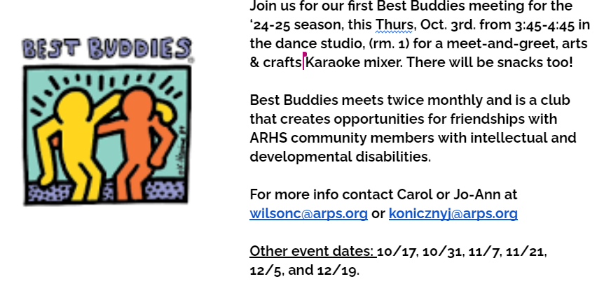 Join us for a Best Buddies meeting this Thurs, Oct. 3rd. from 3:45-4:45 in the dance studio, for a meet-and-greet Karaoke mixer. There will be snacks too!